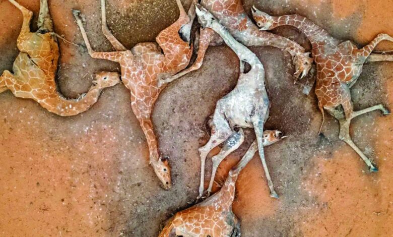 جراء احتباس الأمطار في هذا البلد الإفريقي المعروف سابقا بفضاءاته الطبيعية التي تعيش فيها المئات من الحيوانات النادرة، تظهر صورة لست زرافات، بأجسادها الهزيلة والمتشابكة، وهي ترقد على الأرض الجافة على شكل دوامة، حجم الدمار الذي خلّفه الجفاف في كينيا، تاركاً الناس والحيوانات يكافحون من أجل الغذاء والماء. وذكرت وكالة «جيتي ايماجيز» في تعليق على الصورة المحزنة التي التقطتها كاميرا المصور الصحافي، إد رام، أن الحيوانات كانت ضعيفة بالفعل ونفقت بعد أن علقت في الوحل، وكانت على ما يبدو تحاول الوصول إلى خزان قريب جفت مياهه تماماً.