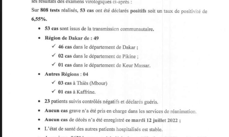 علنت وزارة الصحة والعمل الاجتماعي السنغالية،اليوم الثلاثاء تسجيل 53إصابة جديدة مؤكدة بفيروس كوفيد 19، و 23حالة شفاء و لم تسجل حالة وفاة جديدة،وقد توصلت الوزارة لهذه النتيجة بعد إجراء 808فحصا.