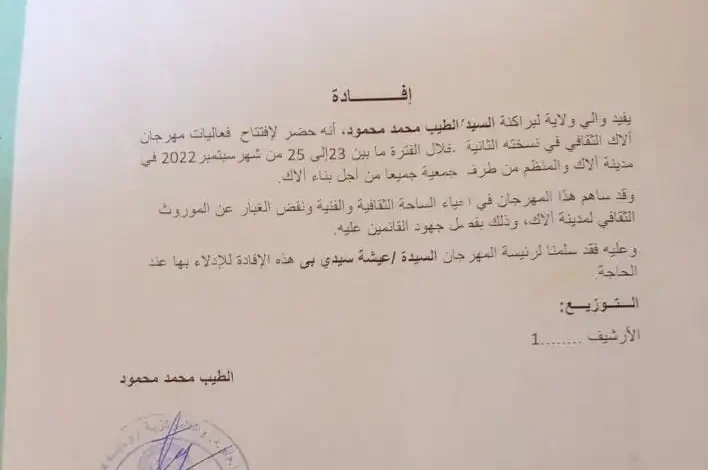 جاء ذلك في إفادة سلمها الوالي لرئيسة المهرجان عيشة سيدي بي وكانت جمعية جميعا من أجل بناء ألاك قد نظمت في الثالث والعشرين وحتى الخامس والعشرين من الشهر الماضي نسخة جديدة من المهرجان تضمنت عدة فقرات الثقافية وفنية.