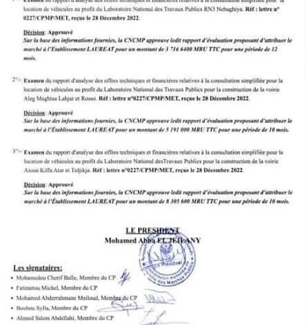 نواكشوط/الحرية نت: من المتوقع أن تجد المهندسة فاطمة منت حدمين، المعينة حديثا مديرة للمختبر الوطني للأشغال العمونية أمامها تركة ثقيلة من الفساد، حيث تحدثت وثائق رسمية عن قيام الشركة باستئجار 10 سيارات لمدة عام بتكلفة قدرها150 مليون اوقية قديمة، حسب ما أكده محضر موافقة صادر عن لجنة الصفقات موقع بتاريخ 25 دجمبر.