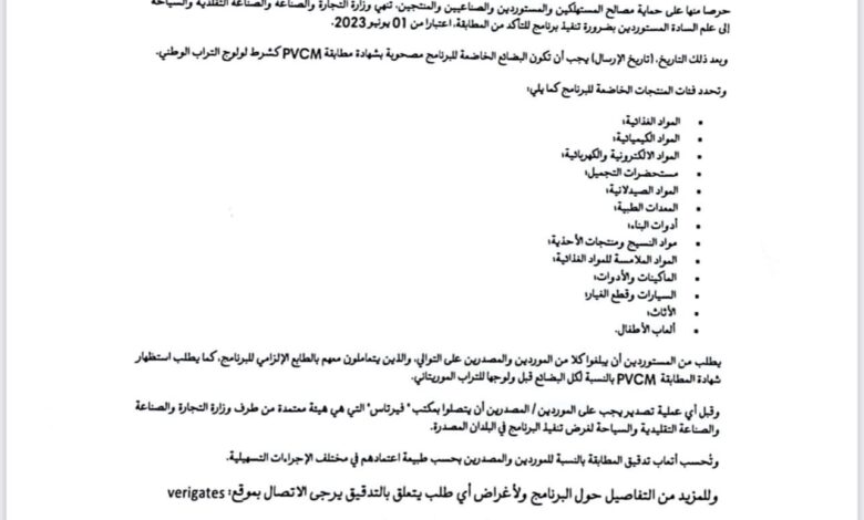 أعلنت وزارة التجارة فرض شهادة مطابقة PVCM كشرط أساسي لدخول البضائع إلى السوق الموريتانية، مطالبة المستوردين بإبلاغ الموردين والمصدرين والذين يتعاملون معهم بالطابع الإلزامي لهذه الإجراءات.