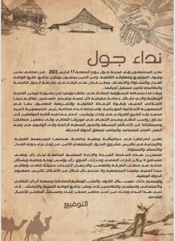 نهيب بكل العلماء والفقهاء والأكاديميين والتربويين والكتاب والمفكرين والشعراء والفنانين ورجال الاعمال والفلاحين والصناع التقليديين والرياضيين والسياسيين والنقابيين والحقوقيين والإعلاميين والعسكريين ….إلى تبني هذا النداء، وذلك من أجل حاصر محفز للبناء ومستقبل مطمئن للأجيال القادمة”.