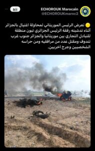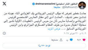 حيث كتب الدكتور منار السليمي أستاذ القانون الدولي بجامعة محمد الخامس بالرباط ، ورئيس المركز الاطلسي للدراسات الاستراتيجية والتحليل الامني ، في منشور على حسابه في موقعإكس :”“المعلومات الأولية تشير إلى محاولة اغتيال مدبرة من طرف النظام العسكري الجزائريوابن الرئيس الموريتاني السابق ، إذ يبدو أن المخابرات العسكرية الجزائرية استغلت التحذيراتالتي نشرتها سفارات الدول الغربية حول قرب هجمات إرهابية للقيام بمحاولة اغتيال الرئيس الموريتاني .
