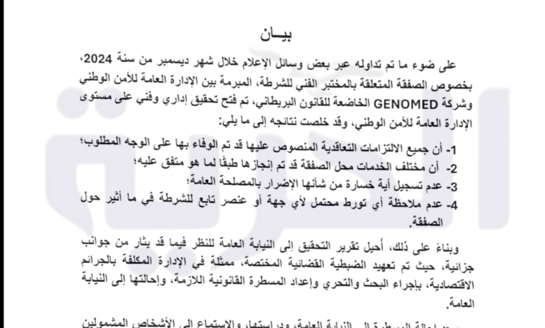 وقالت النيابة في بيان صادر اليوم إنه “على ضوء ما تم تداوله عبر بعض وسائل الإعلام خلال شهر ديسمبر من سنة 2024، بخصوص الصفقة المتعلقة بالمختبر الفني للشرطة، المبرمة بين الإدارة العامة للأمن الوطني وشركة GENOMED الخاضعة للقانون البريطاني، تم فتح تحقيق إداري وفني على مستوى الإدارة العامة للأمن الوطني، وقد خلصت نتانجه إلى ما يلي: