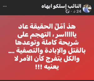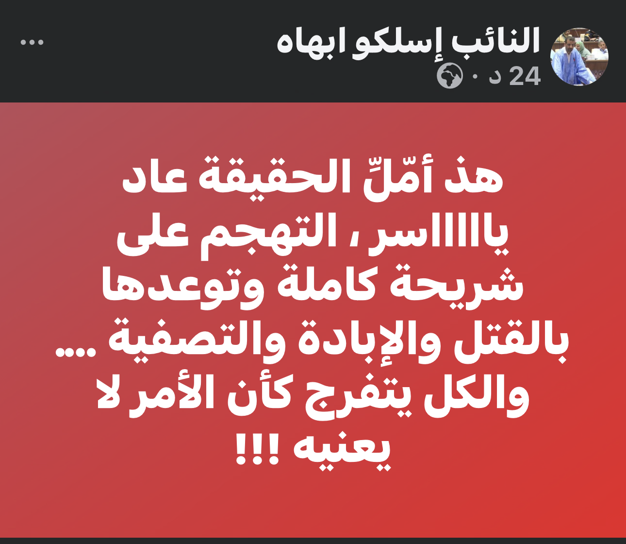 وأكد ولد ابهاه في تدوينة له أن الوضع “تجاوز الحد”، مشيراً إلى رصد حالات تهجم حرضت على “الإبادة والتصفية والتوعد بالقتل” ضد شريحة وطنية كاملة.