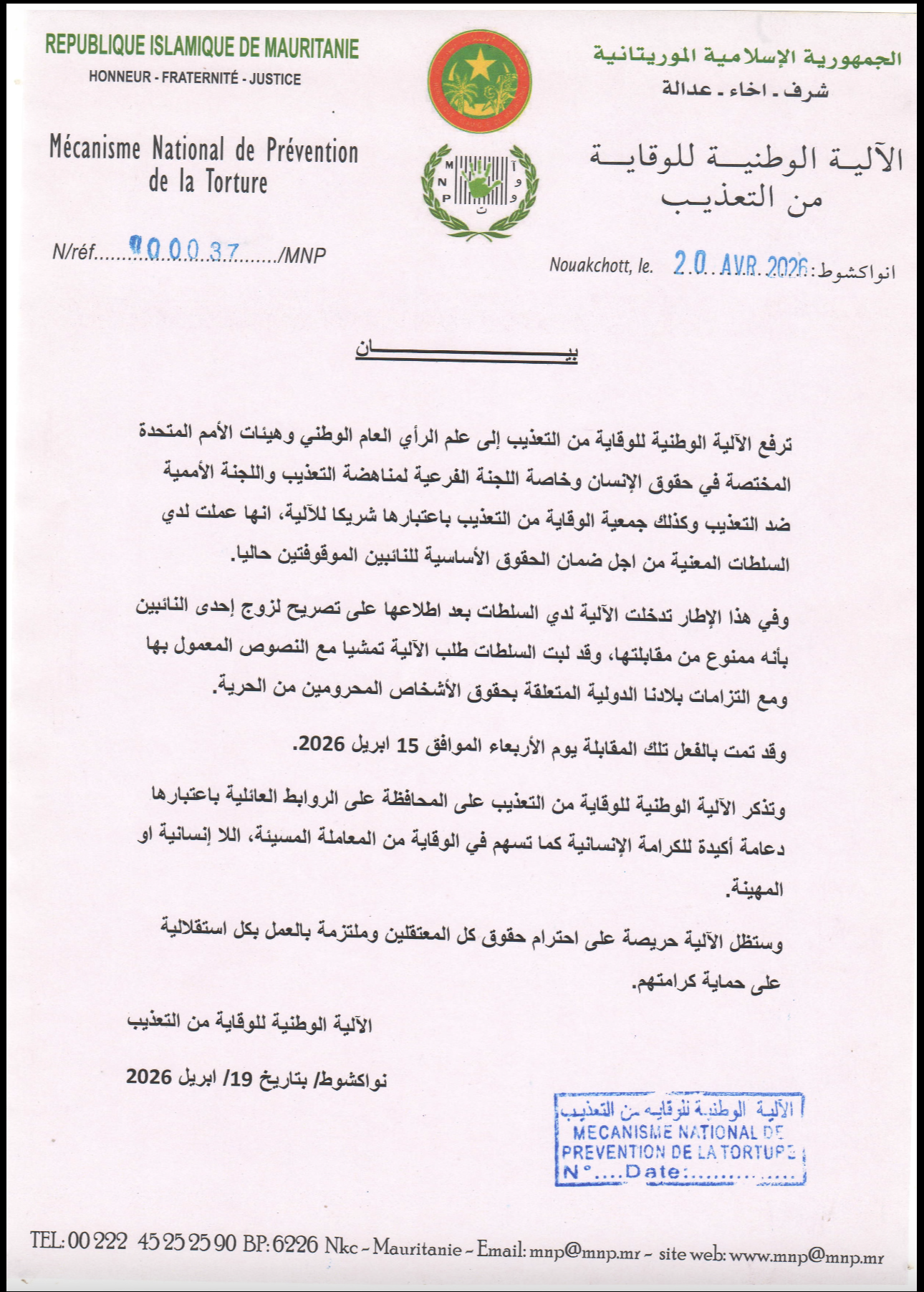 أعلنت الآلية الوطنية للوقاية من التعذيب أنها اتخذت إجراءات لدى السلطات المختصة لضمان احترام الحقوق الأساسية لنائبتين موقوفتين حاليًا، مؤكدة إبلاغ الرأي العام الوطني وهيئات الأمم المتحدة المعنية بحقوق الإنسان بهذه الخطوات.